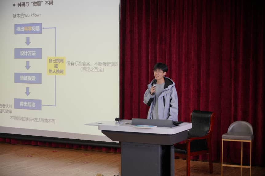 王隆昊学长结合自身科研训练经历,向同学们分享了科研过程中应具备的正确心态,包括从基础“小科研”入手、重视写作与汇报、保持耐心积累,以及带着问题意识学习、主动沟通提问的重要性,并讲解了本科科研的相关实操思路。