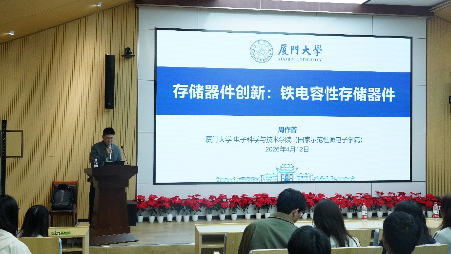 2026年4月12日下午,由山东大学信息学院主办的弘信讲坛于山东大学青岛校区N7-330报告厅顺利举行。本期讲坛聚焦“微电子器件与新型存储技术前沿”,特邀两位国家级青年人才——厦门大学电子科学与技术学院周作普教授、华中科技大学集成电路学院韩恺桢教授,为我们带来两场高水平学术报告。带领我们共同走近器件创新与存储技术发展的学术前沿。
